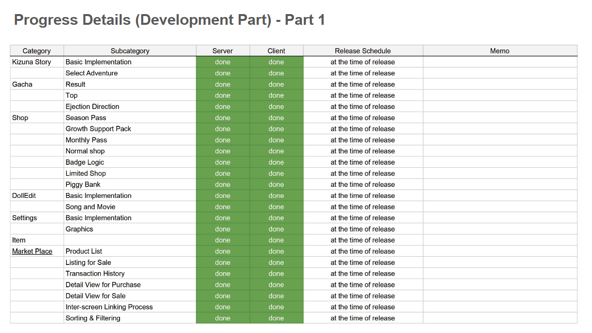 The specification design is complete, the production of art resources is almost complete, and we are currently in the stage of QA for items that are ready for confirmation while proceeding with the development of other items.